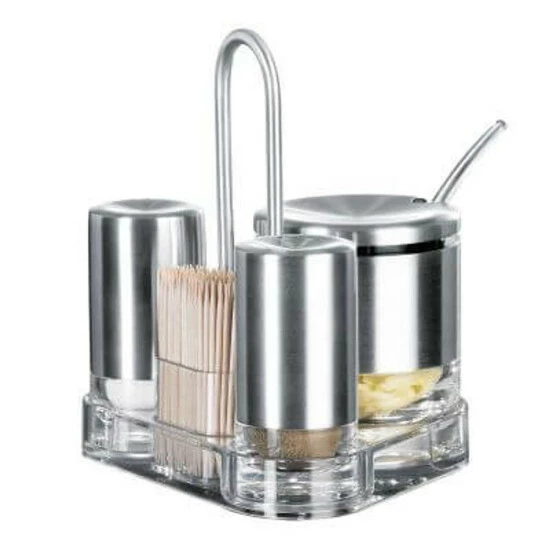 Dieses Set beinhaltet einen Salz- und einen Pfeffer-Streuer, eine Universaldose für Senf oder Marmelade. Außerdem bietet es Platz für Zahnstocher.