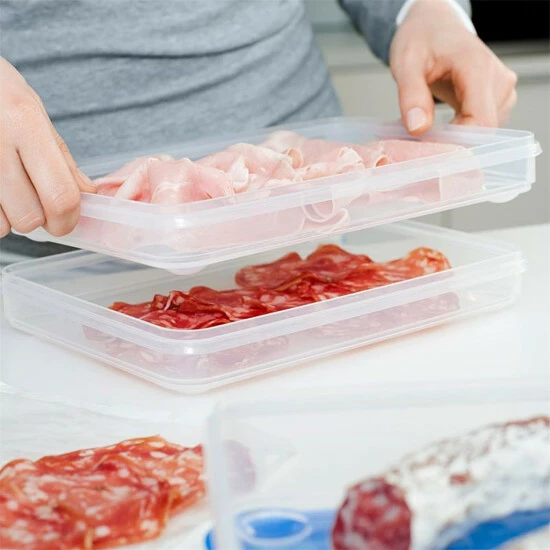 - Luftdichte und keimfreie Aufbewahrung – Längere Frische für Zuhause: Kompaktes Aufschnittbox-System mit 2 Boxen und 1 Deckel zur Aufbewahrung von Wurst oder Käse, Einzigartige Frischedichtung ohne Zwischenräume