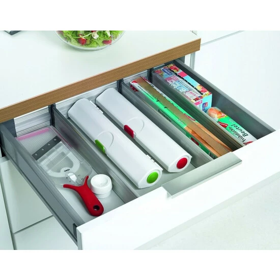 Material: Kunststoff Länge: ca. 33 cm Farbe: weiß, grün Passt perfekt in jede Schublade Geeignet für Alu- und Frischhaltefolie (nicht im Lieferumfang enthalten)
