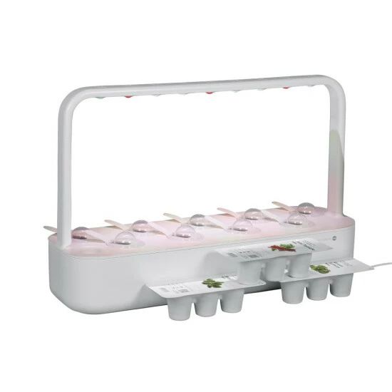 Die energieeffiziente LED-Beleuchtung wird automatisch reguliert, damit die kleinen Pflanzen im Indoor Garten die optimale Wachstumsbeleuchtung bekommen. Unter den Hauben herrscht ein gewächshausähnliches Klima – also die optimale Bedingung für Kräuter und Gemüse, um zu wachsen und Wurzeln zu schlagen. Sobald die ersten kleinen Keime aus der Erde sprießen, kann dann die Haube abgenommen werden.