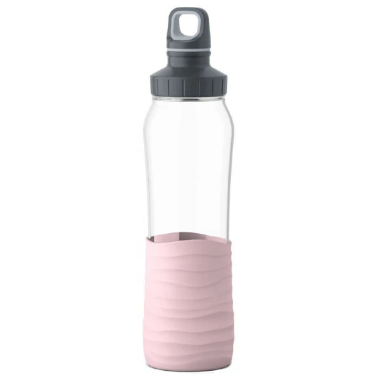 Trinkflasche aus gehärtetem Glas mit trendiger Silikonmanschette. 100 % dicht, auch bei kohlensäurehaltigen Getränken. 100 % unbedenklich, da frei von BPA und sonstigen Weichmachern. Einfache Reinigung in der Spülmaschine. Der Deckel hat 2 praktische Öffnungen: eine kleine Trinköffnung und eine Weithalsöffnung zum Befüllen und Reinigen. Die Silikonmanschette mit trendigem Wellenmuster sorgt für Stabilität und guten Halt.