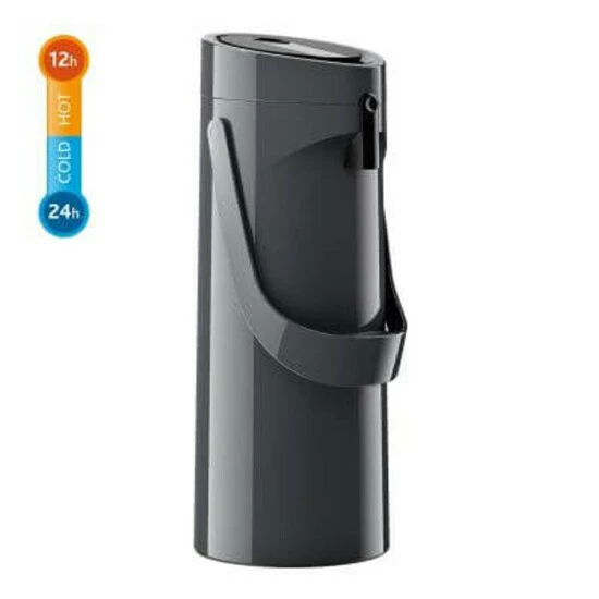 Material: Kunststoff Maße: ca. 16 x 38 cm Farbe: anthrazit Füllmenge: ca. 1,9 Liter Der doppelwandige Vakuum-Glaskolben hält das Getränk bis zu 12 Stunden heiß oder bis zu 24 Stunden kalt. Das “Comfort Press”-System ermöglicht ein leichtes Pumpen. Durch den drehbaren Fuß kann die Isolierkanne problemlos in verschiedene Richtungen geschwenkt werden. Verfügt über eine Auffangschale. Nach Abnahme der Auffangschale wird der Griff für einen sicheren Transport hochgeklappt. Der Pump-Knopf kann beim Befüllen und Reinigen abgenommen werden. Die ideale Kanne bei Geburtstagen oder anderen Feiern.