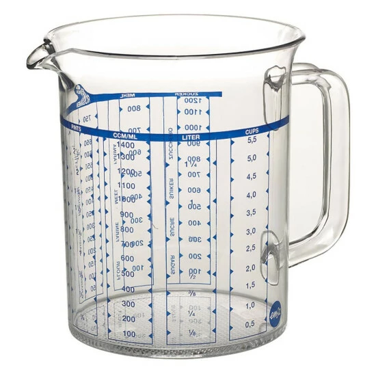 Maßkanne / Messbecher Superlinetransparentspülmaschinenfest und bruchsicherMaterial: SAN bis 90°C hitzebeständigInhalt: 1 LiterGröße: 18 x 13 x 15 cm
