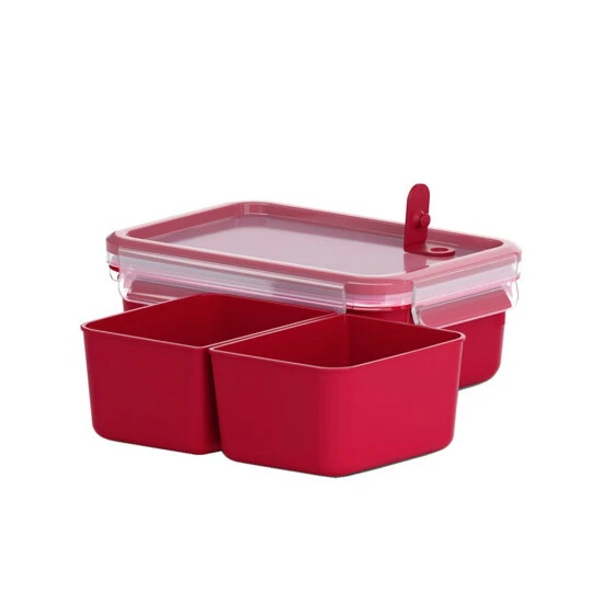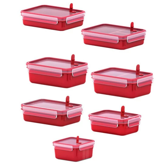 Emsa Mikrowellendose Clip & Close mit Einsätzen Material: Polypropylen Farbe: rot Maße: ca. 19,7 x 13,6 x 7,2 cm Füllmenge: 1 Liter