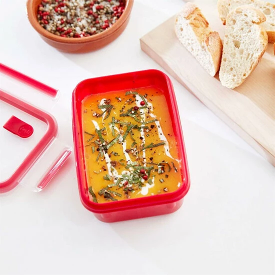 Diese Frischhaltedose fasst bis zu 1,2 Liter und verfügt für die Nutzung in der Mikrowelle über ein Ventil. Sie ist mit einem transportsicheren Clipverschluss sowie einer einzigartigen Dichtung ausgestattet und eignet sich auch für Babynahrung.