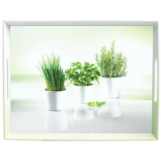 Servieren mit Stil! Mit dem Tablett von Emsa lassen sich Ihre Speisen stilvoll servieren. So schmeckt es gleich noch besser! Das rechteckige Tablett mit den Maßen 50 x 37 cm ist aus hochwertigem Melamin gefertigt. Das Material ist besonders widerstandsfähig und kratzfest, weshalb es sich optimal für die Nutzung im Küchenbereich eignet. Das Tablett ist mit einem schönen Lavendel-Motiv versehen, das nicht nur die Mitte des Tabletts schmückt, sondern ebenfalls den Rand des praktischen Küchenhelfers verziert. Damit sich Ihre Speisen sicher zu Tisch bringen lassen und nichts über Bord geht, ist das Tablett mit einem extra hohen Rand versehen. Zusätzlich sorgen 2 praktische Tragegriffe für einen stabilen Halt während des Servierens. Nach dem Gebrauch müssen Sie das Tablett nicht im Schrank verstauen, sondern können es als hübsches Küchenaccessoire in Ihrer Küche aufstellen. Produkte, die nicht nur das tägliche Leben in Küche und Haushalt erleichtern, sondern es auch bunter gestalten – dafür steht Emsa bereits seit über 60 Jahren. Dabei setzt das Unternehmen ausnahmslos auf innovative Ideen und beste Qualität und schafft auf diese Weise eine einzigartige Produktwelt.