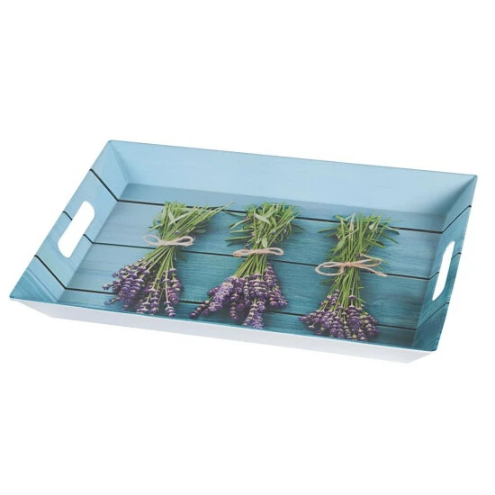 Robustes Emsa Classic Tablett Lavendel Material: Kunststoff Maße: 50 x 37 cm Mit extra hohem Rand für einen sicheren Transport Ineinander stapelbar Mit eingearbeitetem Holz-Dekor bis in den Rand mit Lavendelbüschelmotiv Der Hintergrund des Tabletts ist nicht wie abgebildet blau-grau, sondern türkis