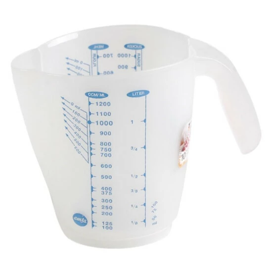 Dieser transparente Messbecher fasst bis zu 1 Liter. Er verfügt über drei übersichtliche Skalen zum einfachen Abmessen der gängigsten Backzutaten, auch in kleineren Mengen.