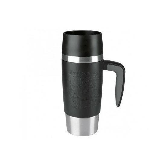 Der Isolierbecher Travel Mug Handle von Emsa in der Farbe Schwarz besteht aus Edelstahl und hat einen Fassungsvermögen von ca. 0,36 l. Für einen angenehmen Halt sorgt das Soft-Touch Element im Griff. Der Becher bietet sehr gute Isoliereigenschaften und kann einfach per Knopfdruck geöffnet werden. Er ist spülmaschinengeeignet und passt dank seiner Form auch ideal in die Autohalterung.