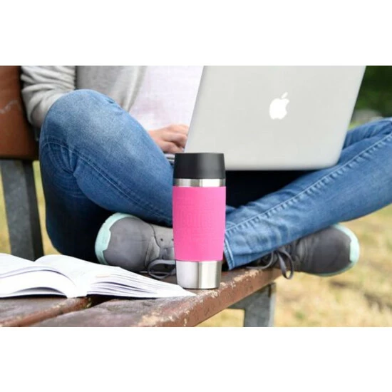Der Isolierbecher Travel Mug, von Emsa, ist dank seiner Eigenschaften der ideale Partner für unterwegs und durch seine Form hervorragend für die Autohalterung geeignet. Der hochwertige, vakuumisolierte Edelstahlkörper dieses Trinkbechers ist mit einer Silikon-Manschette, versehen, die über eine trendige Kaffee-Prägung verfügt. Durch diese Manschette erhält der Becher nicht nur ein attraktives Design sondern, zusätzlich zu seinem rutschfesten Boden, auch eine rutschfeste Griffzone. Weiter warte der spülmaschinenfeste Thermobecher mit einen Quick Press Verschluss, zum einfachen öffnen per Knopfdruck auf. Der Deckel, der über eine 360° Trinköffnung verfügt, lässt sich zudem leicht zerlegen was eine vollständige Reinigung ermöglicht.
