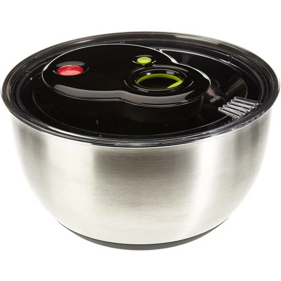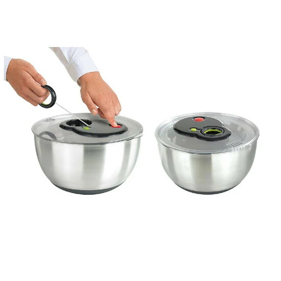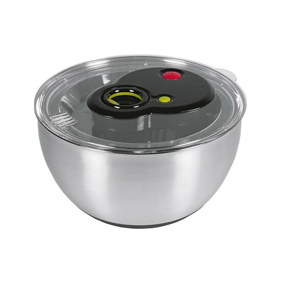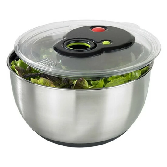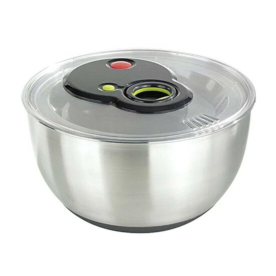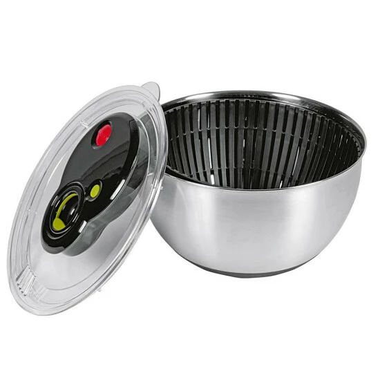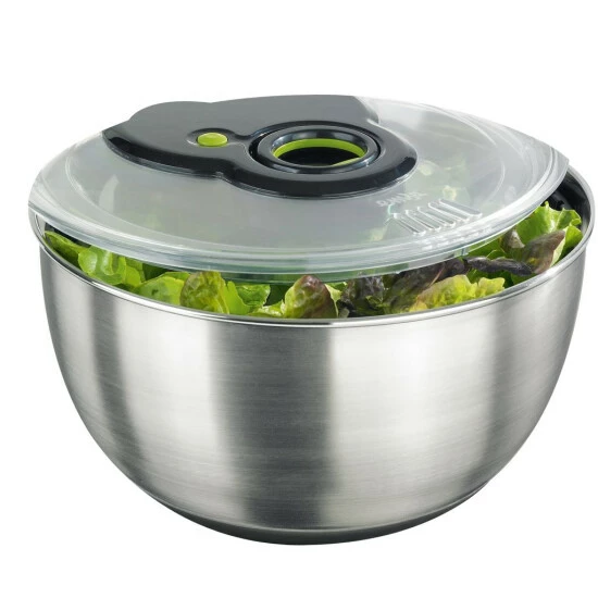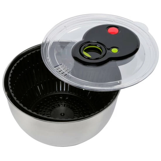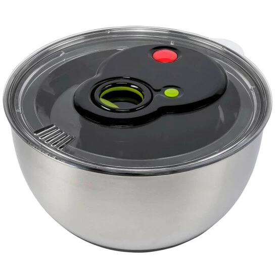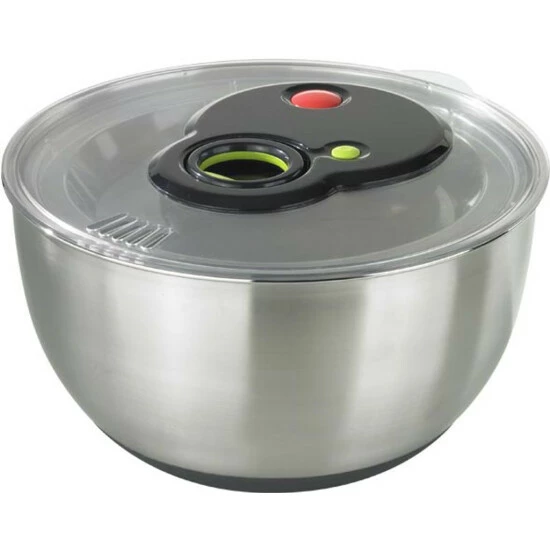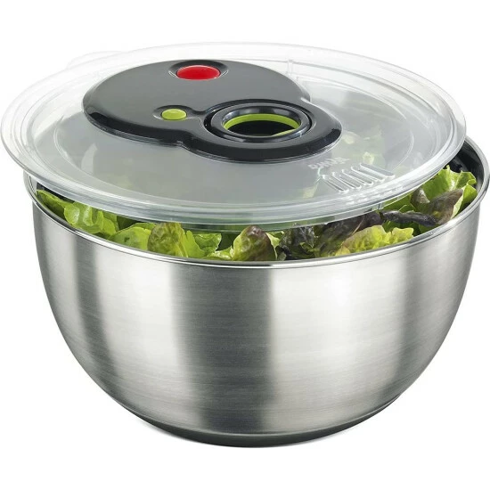 Das Unterteil dieser stabilen Salatschleuder besteht aus Edelstahl und eignet sich sehr gut zum Servieren von Salaten auf dem Tisch.